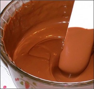 Derreta 150 g do chocolate.- Coloque o conteúdo derretido em um recipiente e deixe esfriar até firmar.