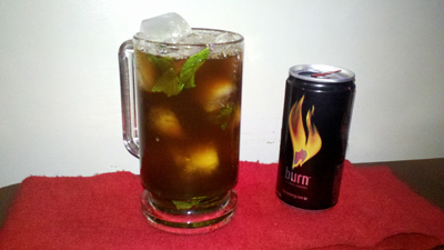 Num copo longo, de preferência de vidro, amasse as folhinhas de hortelã fresco mas deixe algumas intactas para dar um estilo de drink de gente grande. Em seguida, adicione gelo até o topo, se possível passando da borda do copo pois o café quente irá derreter parte dos cubos. Uma vez feito isso, adicione uma xícara pequena (ou grande…depende do seu vício) de café sem açúcar bem quente e feito na hora, claro. Depois, abra sua lata de Burn e despeje o conteúdo no copo, até o topo. Provavelmente não haverá espaço para a lata inteira de energético dentro do seu copo mas aí entra outra coisa divertida do Bizarre ™: você vai completando com o que resta de energético e o sabor vai mudando aos poucos, com a diminuição do café e aumento do energético no copo.