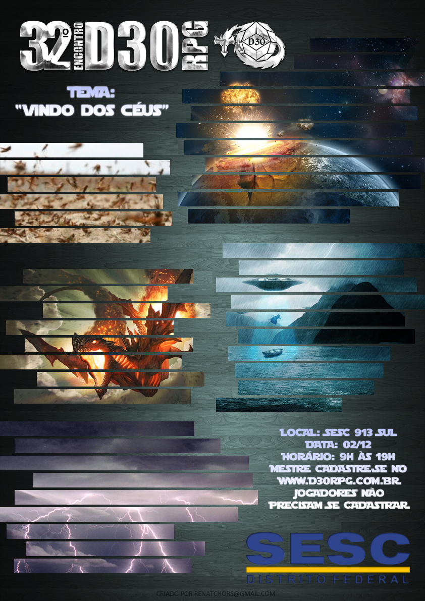 Lembre-se de que ainda dá tempo de inscreverem suas mesas! No último post sobre o evento enumeramos algumas ideias: um dragão, um asteroide, cometa, nave espacial, chuva ácida, nuvem de gafanhotos, raios e trovões, deuses zangados… o que você quiser colocar na sua aventura. Claro que o tema é opcional, e se você quiser pode levar a aventura que você já tinha preparado e não tem nada a ver com isso, mas fica o desafio! Na dúvida do que fazer de uma olhada nos conselhos que estão no site do D30 para aventuras em dia de evento!
